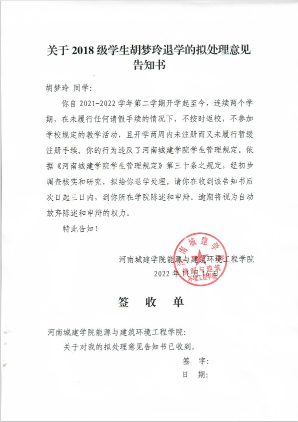 关于2018级员工胡梦玲退学的拟处理意见告知书