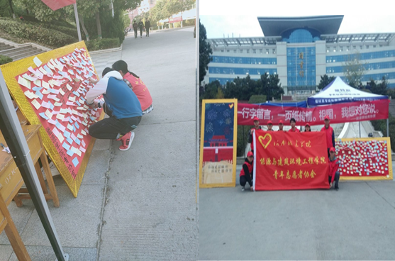 为保障活动顺利的进行,能源青协对此进行了严密的策划,并在做好了相关的前期准备工作之后,决定于11月12日在图书馆下的喷泉广场设立活动点,摆放好事先准备的宣传画板、留言板,随即展开了活动。活动期间,能源青协的志愿者们耐心的为前来询问的同学们进行了本次活动的讲解,并指导他们参与本次的活动。不仅如此,能源青协的志愿者们还主动上前鼓励过往的同学们积极参与本次活动,让其写下他们想对祖国说的“情话”,与此同时,志愿者们对此拍照留念,记录下了这一个个美好的时刻。