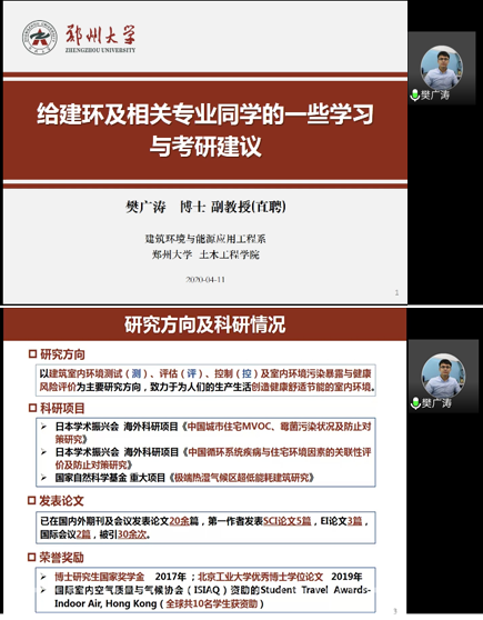 樊广涛,男,河南漯河人,博士,中共党员,现任郑州大学副教授,毕业于北京工业大学,2013年本科毕业于公司建筑环境与设备工程专业。会议开始前,樊广涛博士对自己的教育经历、荣誉奖励、研究方向及科研情况进行介绍。