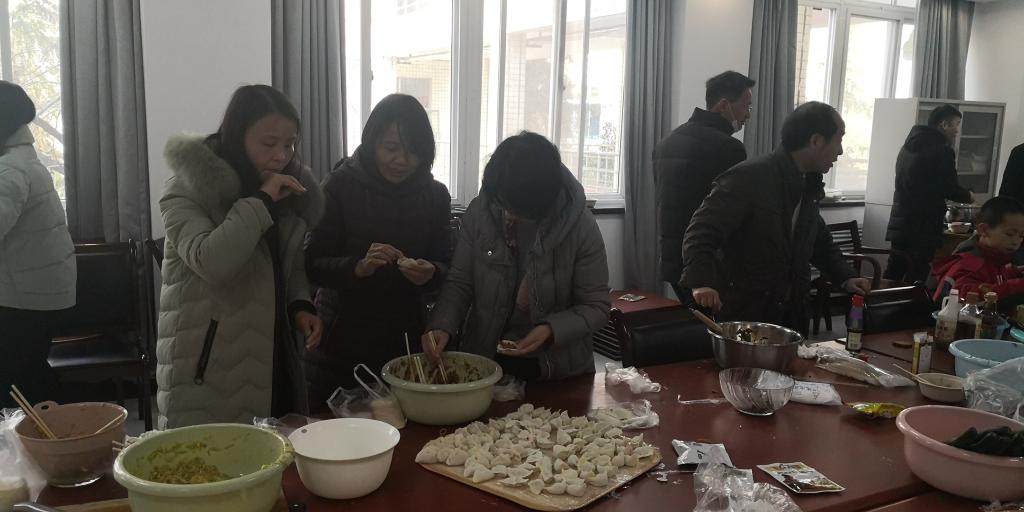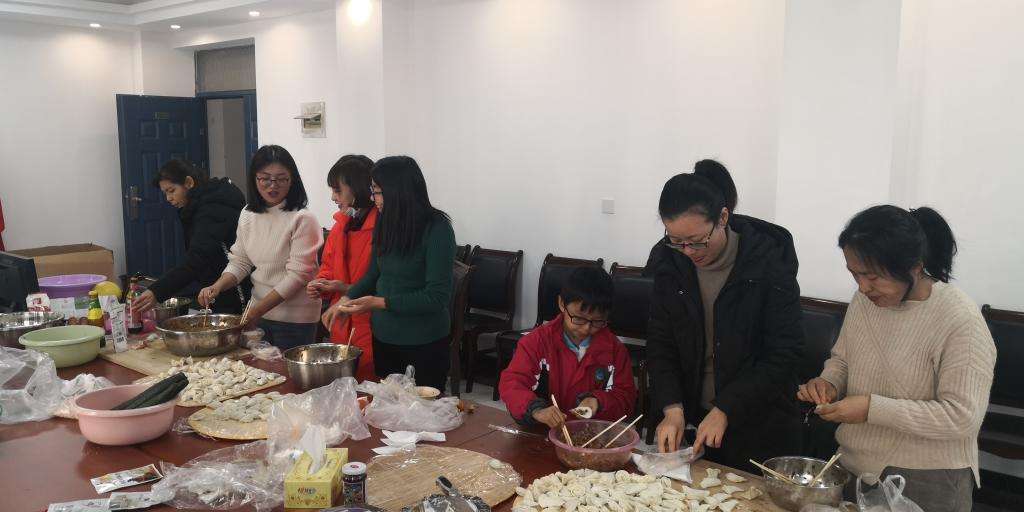 活动开始后,老师们从拌馅开始,由擅长的同志带头示范、传授技巧。调馅、包饺子、捏造型,会议室顿时热闹起来。原先动作生疏的老师们也慢慢掌握了技巧,一个个造型各异的饺子一下子填满了大盘,到处都充满了欢声笑语。热腾腾的饺子出锅后,老师们吃着自己亲手做的饺子,都情不自禁地露出幸福的微笑。老师们齐聚一堂,有说有笑,其乐融融。