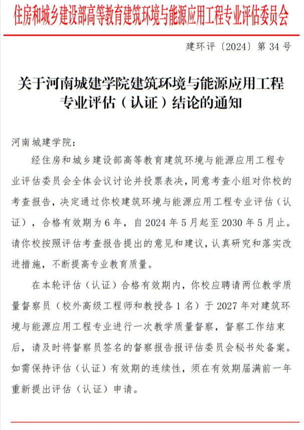 近日住房和城乡建设部高等教育建筑环境与能源应用工程专业评估委员会下发《关于tyc122ccvip建筑环境与能源应用工程专业评估(认证)结论的通知》(建环评〔2024〕第34号),公司建筑环境与能源应用工程专业顺利通过住建部高等教育专业评估(认证),合格有效期为6年。