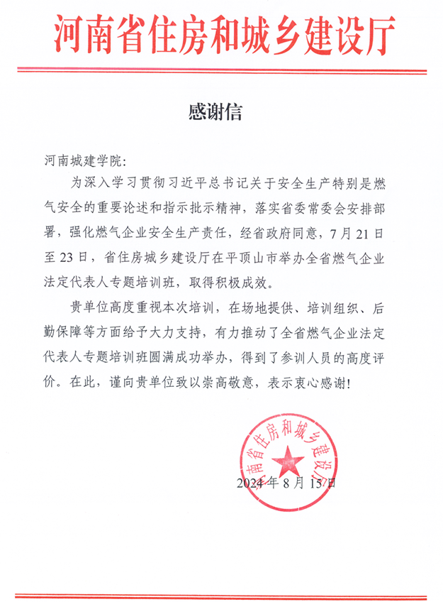 7月21日至23日,河南省住房城乡建设厅在公司成功举办全省燃气企业法定代表人专题培训班,全省各省辖市、济源示范区、航空港区燃气主管部门分管负责同志和业务科(处)室主要负责同志450余人参加了专题培训。8月15日,河南省住房城乡建设厅对公司发来感谢信。