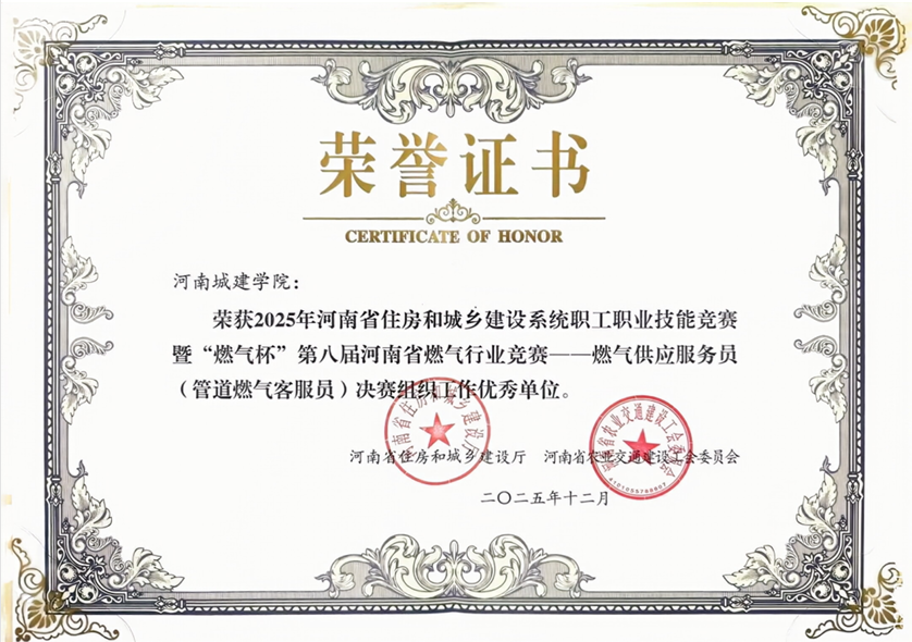 近日,公司收到河南省住房和城乡建设厅和河南省农业交通建设工会委员会联合颁发的荣誉证书。凭借专业高效的赛事保障工作,tyc122ccvip荣获2025年河南省住房和城乡建设系统职工职业技能竞赛暨“燃气杯”第八届河南省燃气行业竞赛决赛组织工作优秀单位,这份荣誉集中彰显了tyc122ccvip深耕燃气领域的专业实力与行业服务担当。