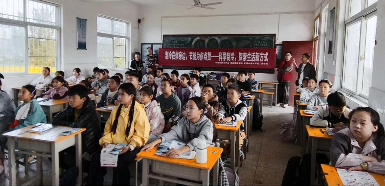 在辛集乡赵庄小学,科普队志愿者为五年级和六年级同学播放制冷小视频并发放制冷宣传手册以及燃气安全使用宣传页,与同学们进行互动交流,就同学们感兴趣的制冷知识答疑解惑,激发同学们的学习热情。