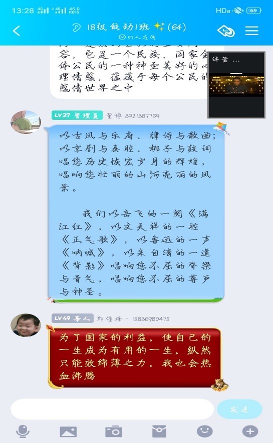 观影期间,同学们都严肃认真,看到动人之时会在班级群里分享自己的感悟与体会,即使在宿舍观看,也丝毫阻挡不了同学们的热血飞扬。重温那段光荣历史,先辈们不怕牺牲,艰苦奋斗为我们创造了如今的和平年代。在剧中毛主席一步步带领中国人民带领中国共产党打倒了反动派和侵略者,建立了新中国。同学们领悟到毛泽东思想是中国共产党的宝贵财富,是我们党所坚持的执政理念,作为当代老员工要以毛泽东思想为行动指南,学习新思想争做新青年!