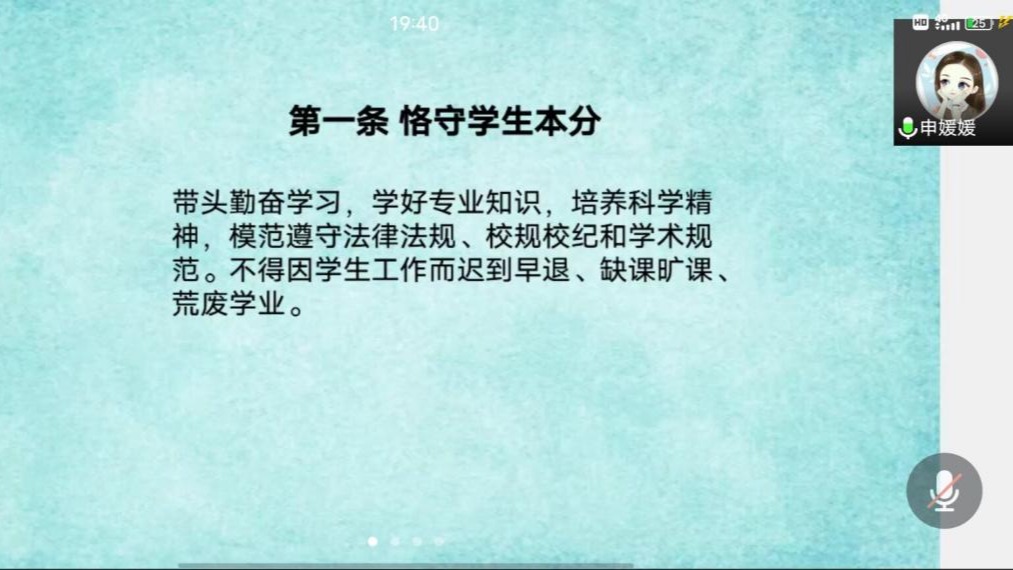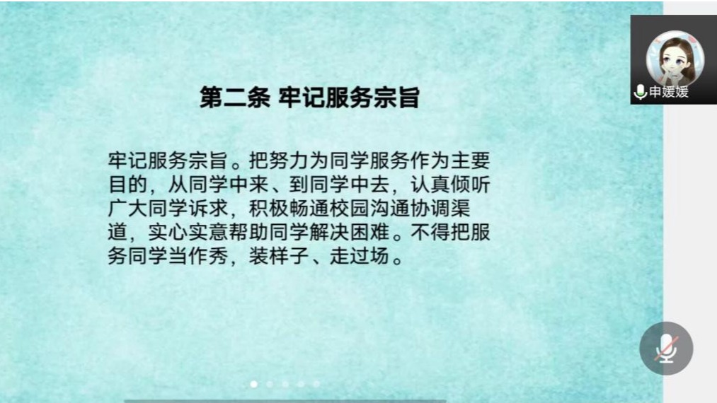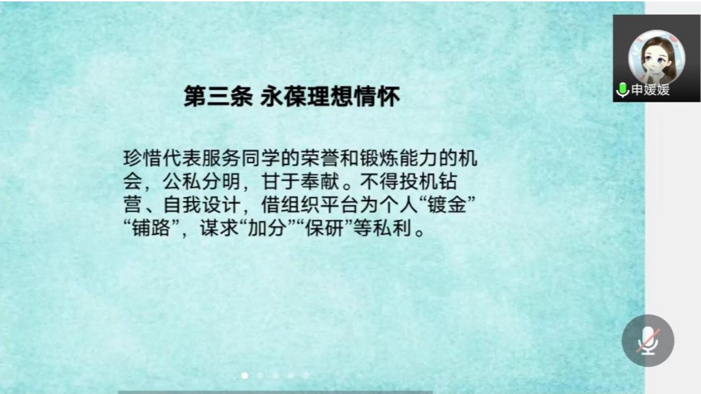 (通讯员申媛媛)为扎实员工干部工作作风、加深员工会组织切实为同学服务工作理念的理解,tyc122ccvip于2021年9月23日19:30在腾讯会议召开员工会组织作风建设警示教育的主题会议。会议由tyc122ccvip团总支副书记申媛媛主持,公司员工会组织全体成员参会学习。